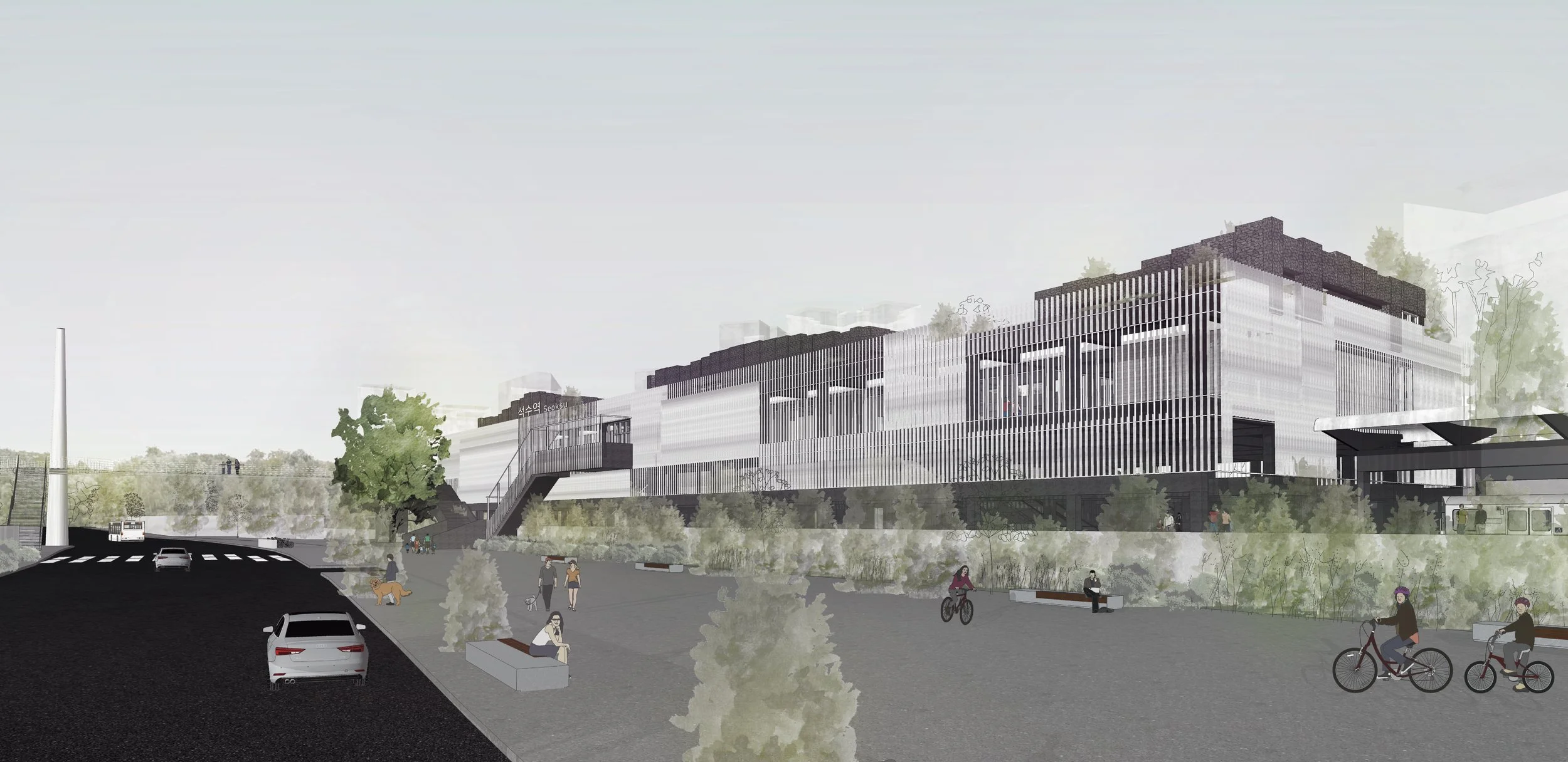 This project expands Seoksu Station into a multifunctional transit hub that integrates transportation efficiency with local community needs. The new design redefines the station not just as a point of transit, but as a layered public space—combining commuter services, neighborhood markets, and lifestyle amenities. By responding to different user speeds and urban rhythms, the station evolves into a platform that supports everyday life, cultural exchange, and regional connectivity.